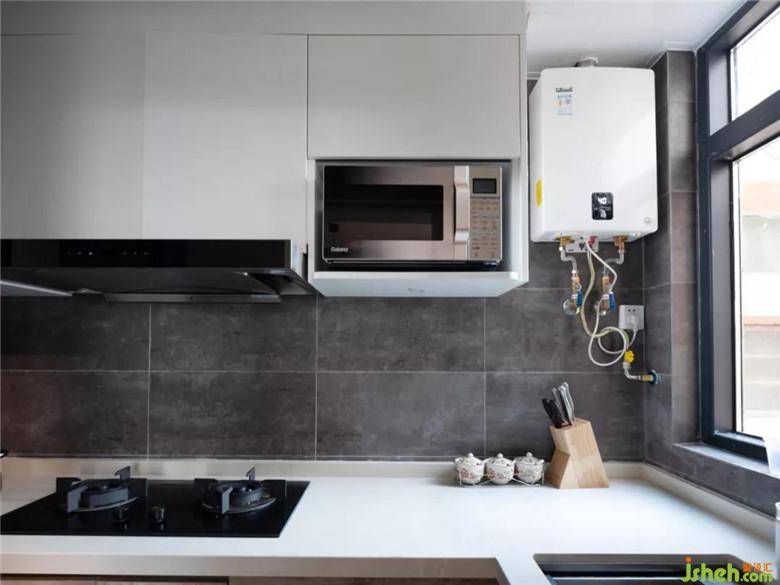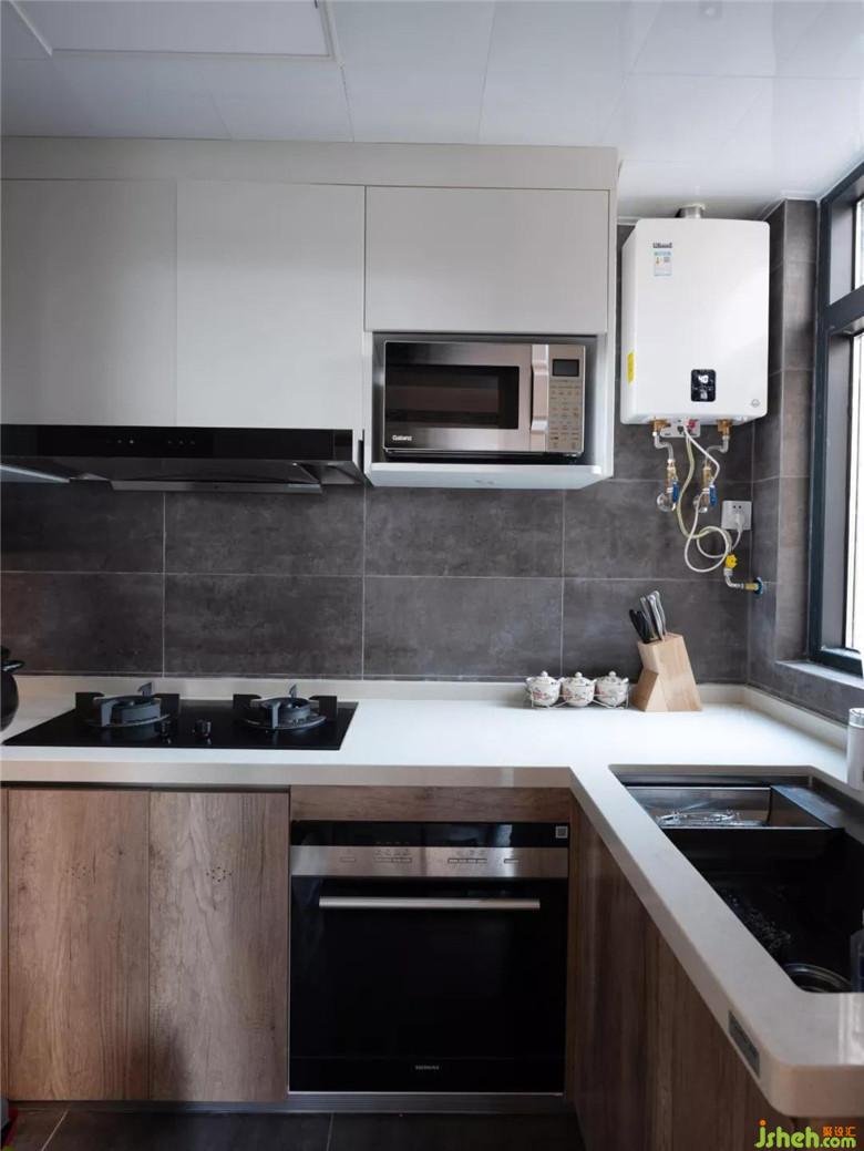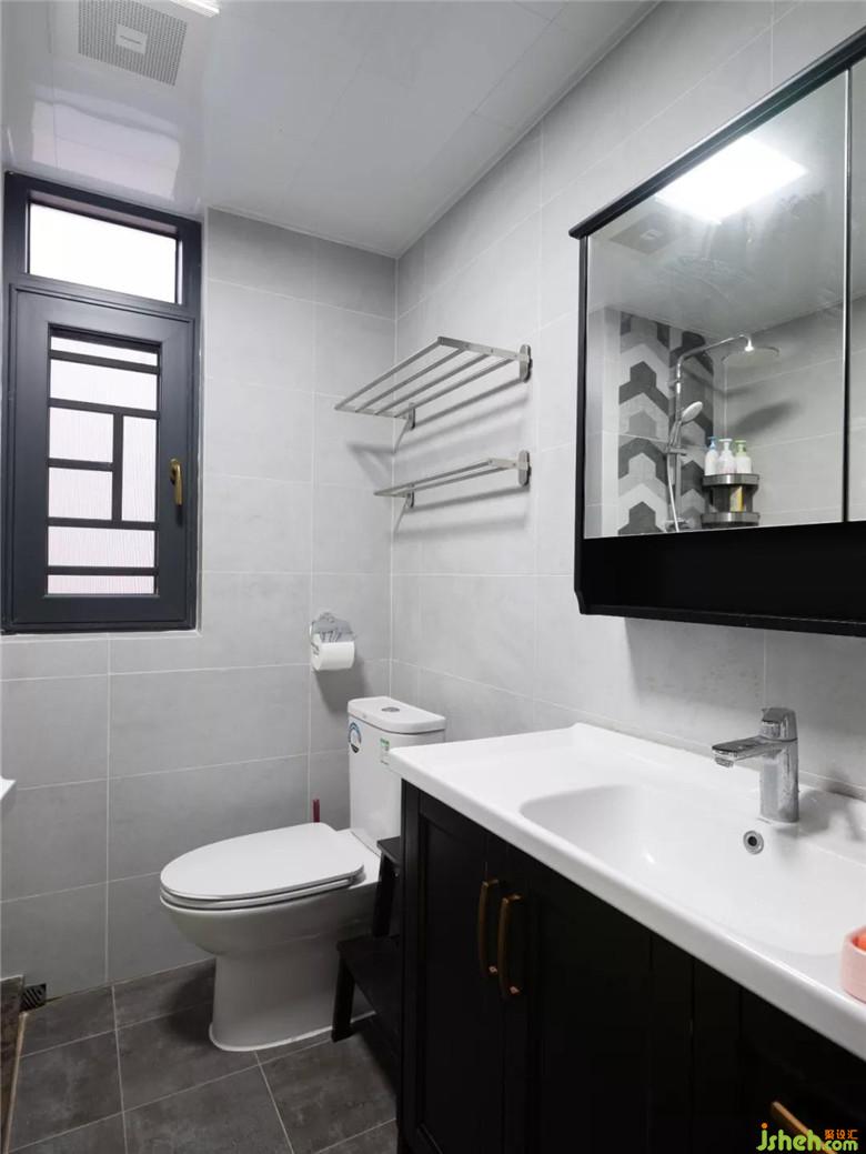 老房子改造前厨房受油烟污染严重,设计师在厨房的天花板改造部分,设计了条形铝扣板天花,这种材质轻便耐用,广泛用于厨房和卫生间吊顶中,既能达到很好的装饰效果,又具备多种优良特性。卫生间同样通过重新安装上条形铝扣板天花,改造后整体清洁干爽,地面铺陈防水地砖,空间深灰色和浅灰色相互交织映衬,简约清新。