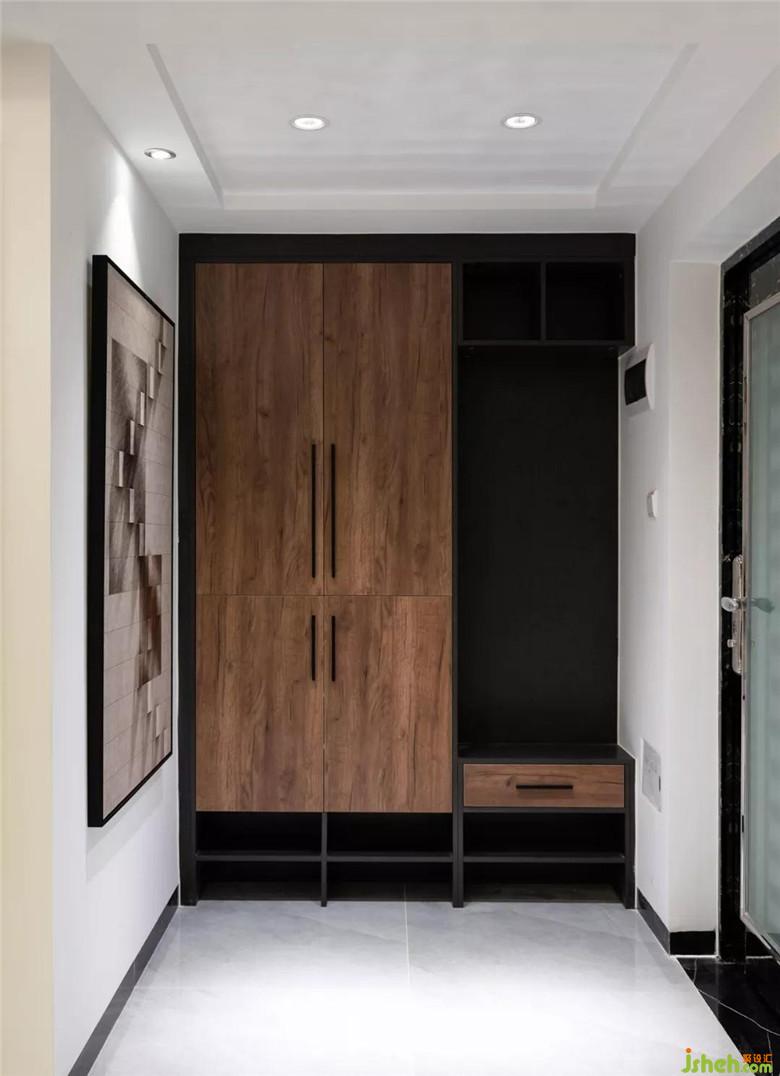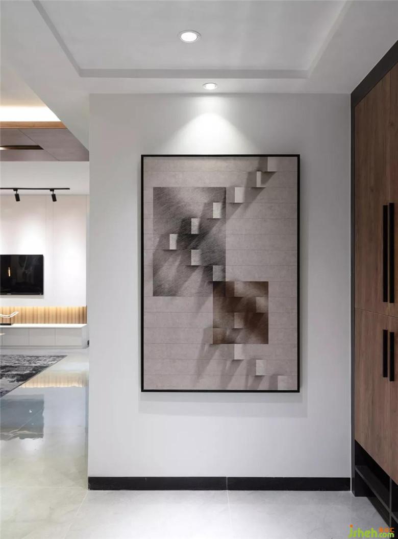 入门处的玄关气质典雅,抽象的挂画在3㎡的空间里,气韵低调奢华;原先的玄关鞋柜设计老旧,改造后的玄关增加1586mm定制柜,柜面的木头纹理,朴实而细腻,柜子不但没有遵循常规鞋柜设计,还结合生活行为设置方便穿鞋的地方。装修设计