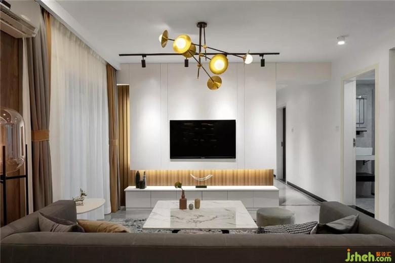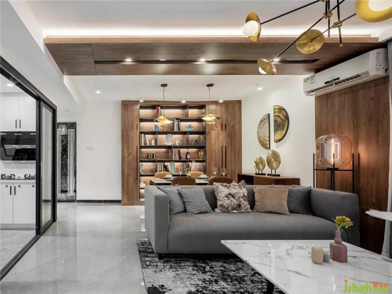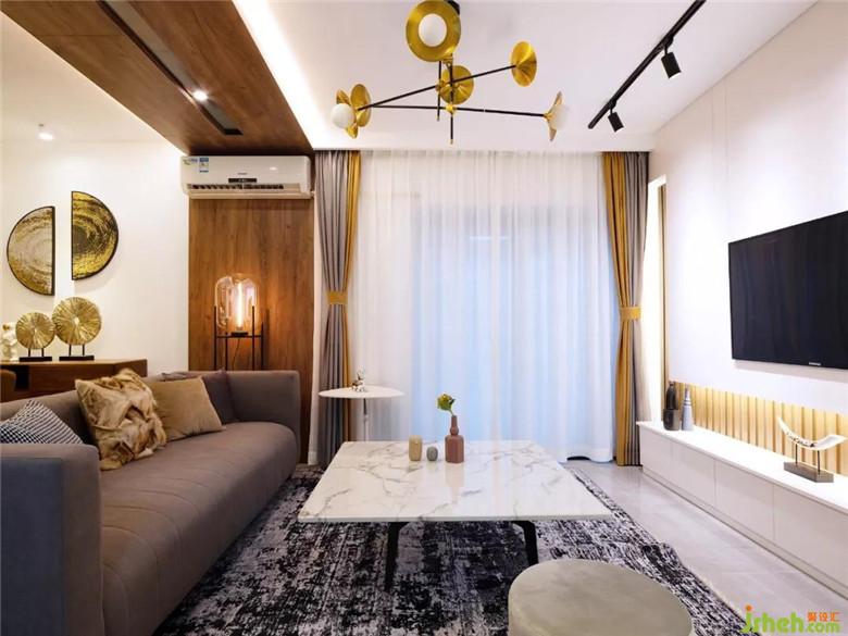 客厅改造后动线清晰,轻奢精致,设计师设计了一面落地窗,打通了和卧室的阳台,增加客厅和卧室的光线,清爽的大理石纹理给客厅增加一缕清凉。客厅做了半吊顶木质的设计,这样一来客厅与餐厅的功能区域更加清晰,复古轻奢的吊灯,金属质地提升了客厅的格调和气质。