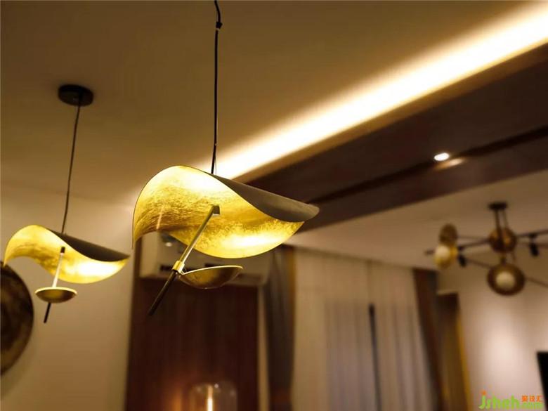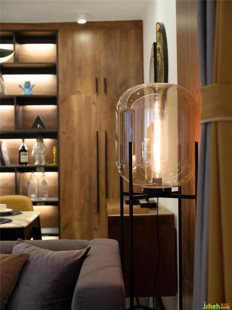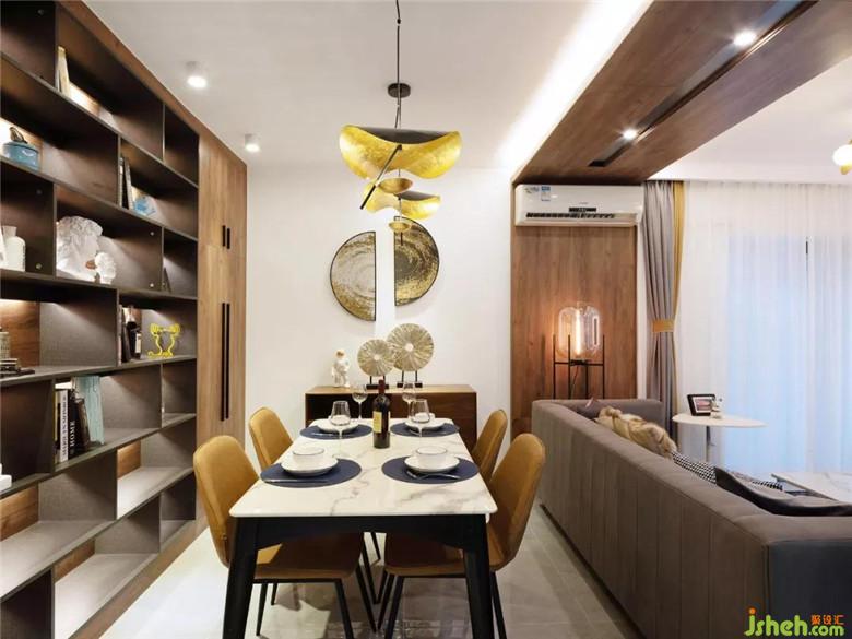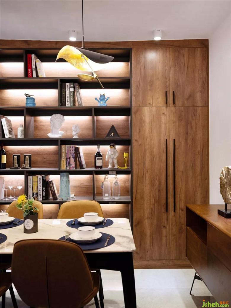 餐厅和客厅在同一空间,却不显突兀。客厅与餐厅天花中间的木质吊顶,让客餐厅功能区分更加清晰。餐桌上方的灯是业主淘回来的复古吊灯,金属的铜片,暖黄的灯光,是一份归家的安心。设计师新设计了木质纹理的置物架,打造充满质感的落地书架,可以放置书籍和业主从世界各地淘回来的展示品。装修设计