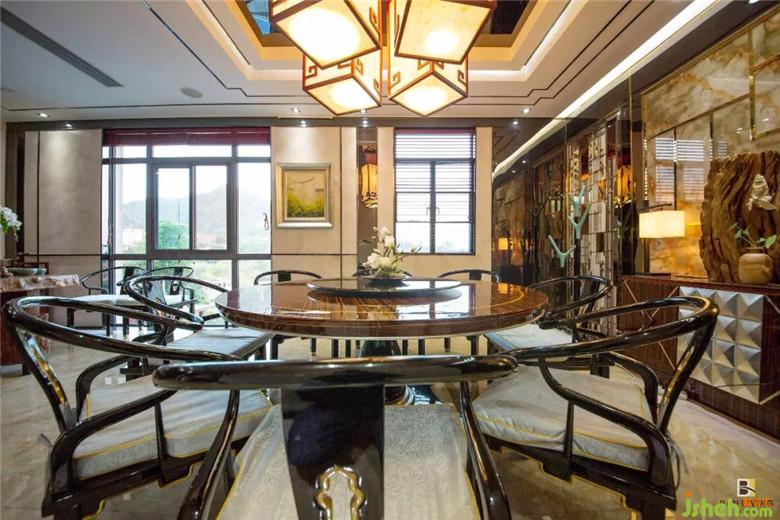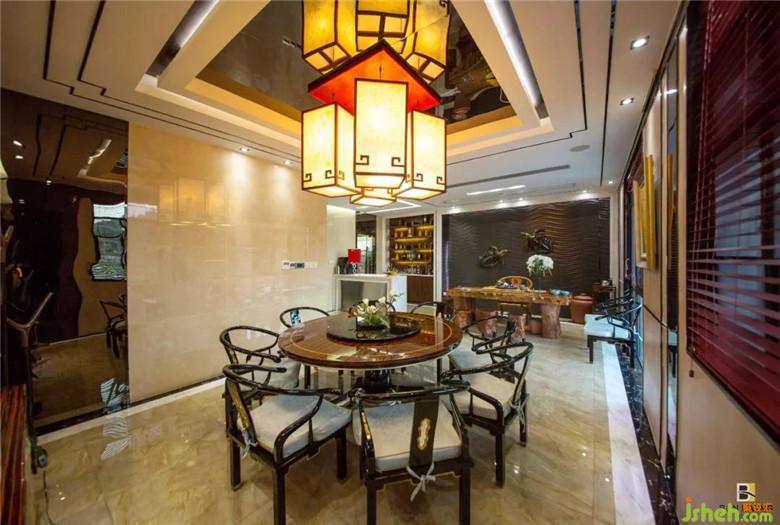 餐厅里悬垂而下的古色生香的吊灯,映出觥筹交错的倒影,透亮的大理石地面与顶上的黑镜钢相映成趣,似在推杯换盏中诉说着心情,耳畔也似传来福寿双鹤的祝语,守护着一家欢喜。