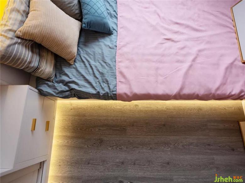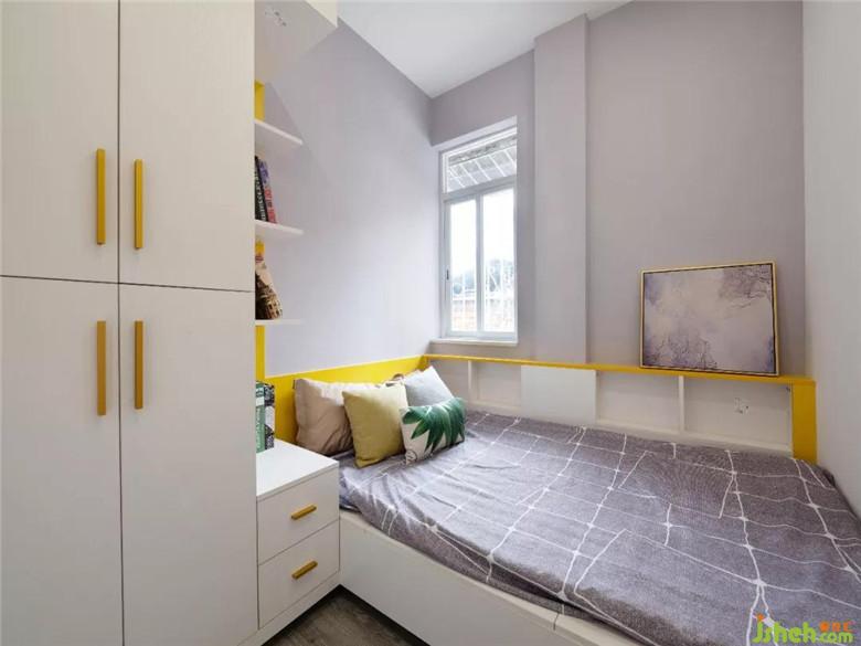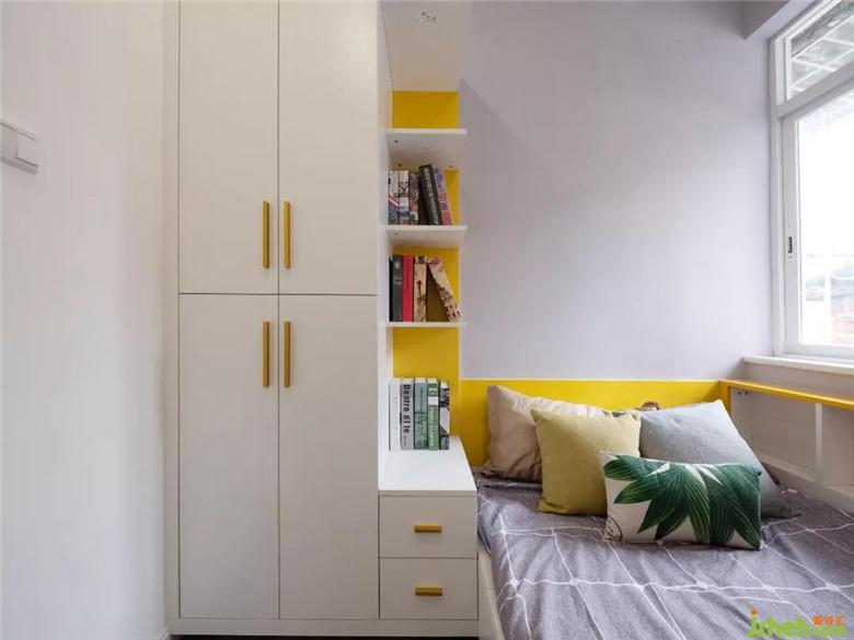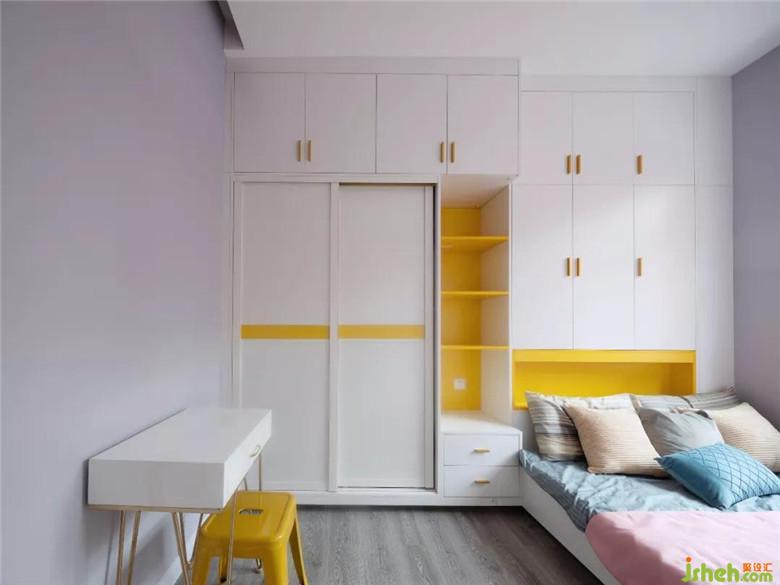 卧室选用实木地板,延续温润遐迩,令空间质感更为饱满。衣柜壁橱大面积的白色主调,点缀一抹亮黄色,显得卧室清新明亮,个性简约。定制的柜橱满足了户主收纳的需求,收纳与简约创造出专属个性,定制的形式让衣柜和墙体的尺寸落得刚刚好
