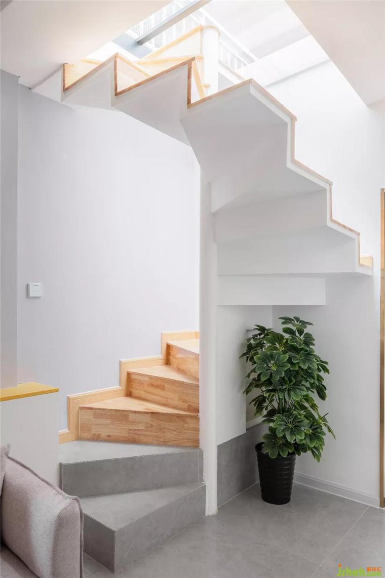 本次改造最具特色的是旋转楼梯的设计,设计师摈弃了传统楼梯设计方式,设计了一个连接天台的旋转楼梯,楼梯的顶部是一个天窗设计,光线的照拂就像沐浴在暖阳下,让整个空间全天保持明亮,楼梯边有一个开关,是可以控制天窗的开关闭合,下雨天时可以关闭天窗,保持室内干燥。
