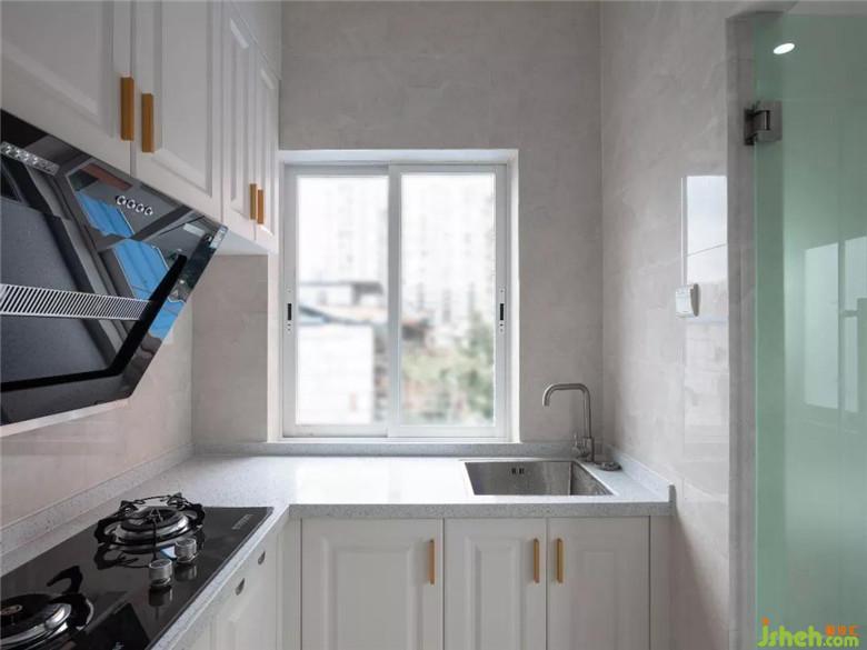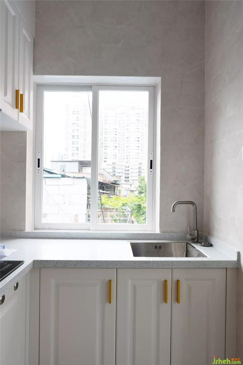 改造前厨房墙体受潮脱落的情况严重,设计师推翻了旧厨房的地砖墙砖和灶台,重新因地制宜设计了L型厨房,白色的壁橱和橱柜,典雅清新,大理石暗纹墙砖高雅简约;设计师设计了两道玻璃门衔接旋转楼梯和卫生间,几平米的空间里合理布局,流畅衔接,完全没有狭窄拥挤的感觉。