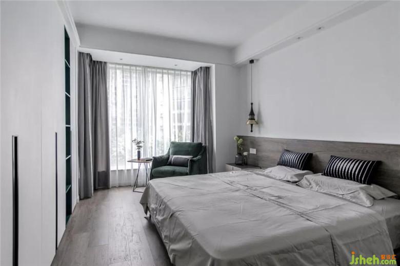 卧室是一个最能体现屋主喜好的一个场所,所有的设计都围绕男女主人展开的,墨绿色的开放柜、个性有趣的吊灯、绿色的单椅、颜色丰富的摆件,让明快的空间增添了的复古气息,彰显了屋主的生活理念。