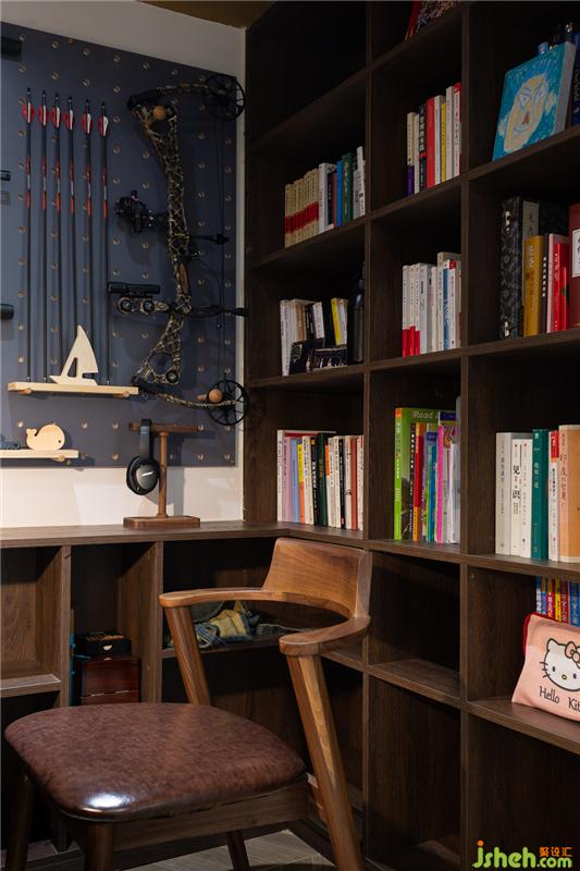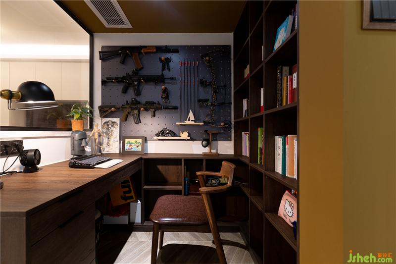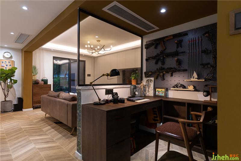 书房由原户型的餐厅改造而来,打破墙体的束缚,与客厅一窗之隔,半墙茶褐色玻璃代替墙体,既能引入客厅的光源,让小小的书房变得通透许多,也加强了书房与客厅的空间互动。