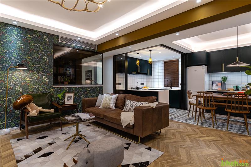 将原始户型中客厅和次卧之间的墙体打通,做成L(客)D(餐)K(厨)一体,就餐区就位于沙发后方。室内设计师