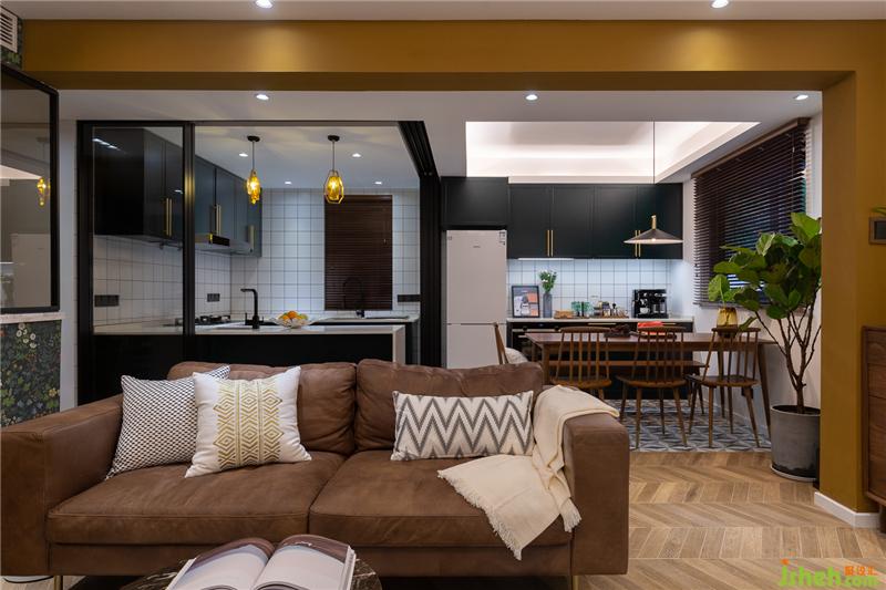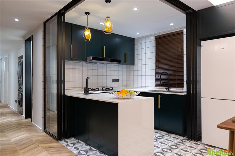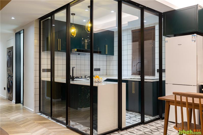 打通原始户型中厨房的墙体,采用开放式厨房的设计,黑色边框的玻璃折叠移门分隔厨餐厅,不遮挡光线,也方便客餐厅之间的沟通。