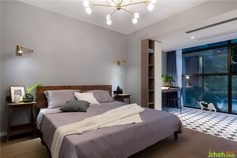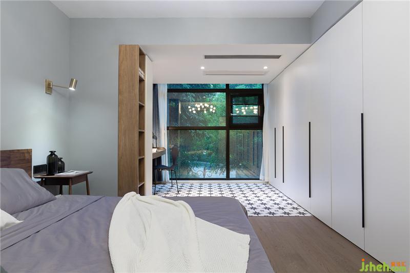 将原有的阳台纳入卧室后,瞬间扩大了卧室的面积,一整面落地窗让屋内通透感十足。不同款式的地板将睡眠区和休闲区做了区分。室内设计师