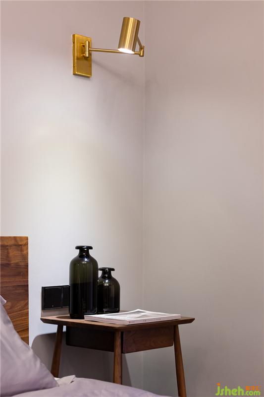 休息的空间无需过多装饰,两把木凳充当了床头柜,小巧简洁的金色射灯增添精致感。