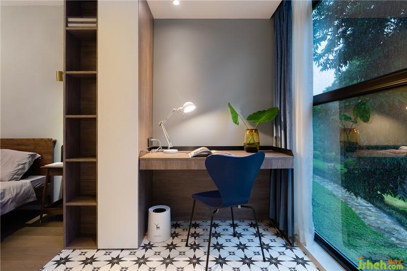 阳台处有一截承重墙不能拆除,利用其长度,左边做了开放式书架,右边做了书桌。临窗读书,白纱帘将光线洗得温柔,窗外绿意葱葱,感觉诗意翩翩。