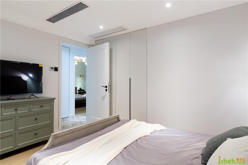 床尾以一整面墙的衣柜代替衣帽间,纯白的颜色使视觉上整洁大气。柜门采用折叠门,收取衣服十分方便。室内设计师