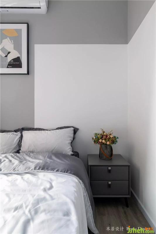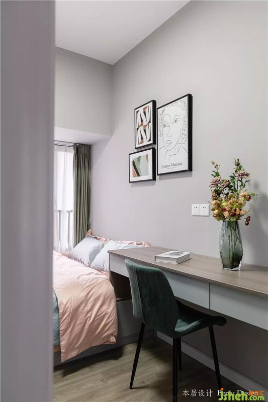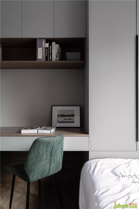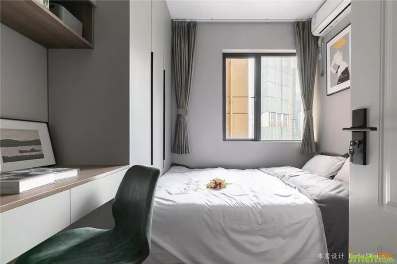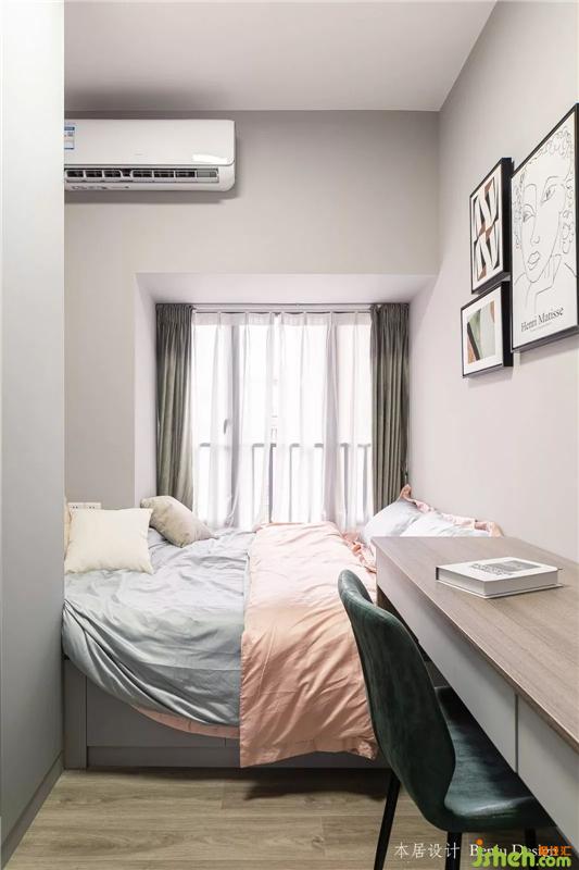 这是入户后的第一个房间,衣柜+床一体式,悬空式的书桌,不占过多的面积。室内设计师