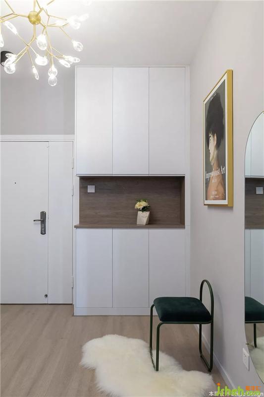 在玄关处定制了一个顶天立地的收纳柜,同时兼顾鞋柜和杂物收纳。中间留空,进门就可以把快递、钥匙、包包、雨伞通通甩在上面。墨绿色的小矮凳,出门换鞋的时候就不怕站不稳东倒西歪啦。穿上好看的衣服,配上温柔的灯光,在镜子前拍个美美的照片,美好的一天就开始了。