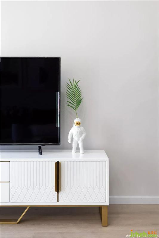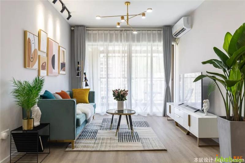 落地窗保证了充足的采光,早晨阳光透过白色的窗纱洒进来,惬意十足。北欧风的圆形茶几,简约又不占地方,沙发旁的放上一盆绿植加以点缀。室内设计师