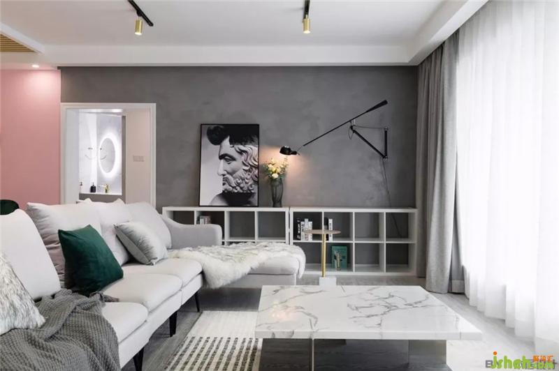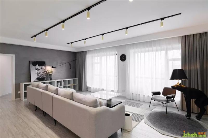 客厅整体以白色为基底,局部采用中性灰色水泥进行搭配,黑色金属的壁灯以点缀。为了视觉上的协调,落地书柜配合沙发的高度,在沙发坐着就能找到自己要看的书。室内设计师