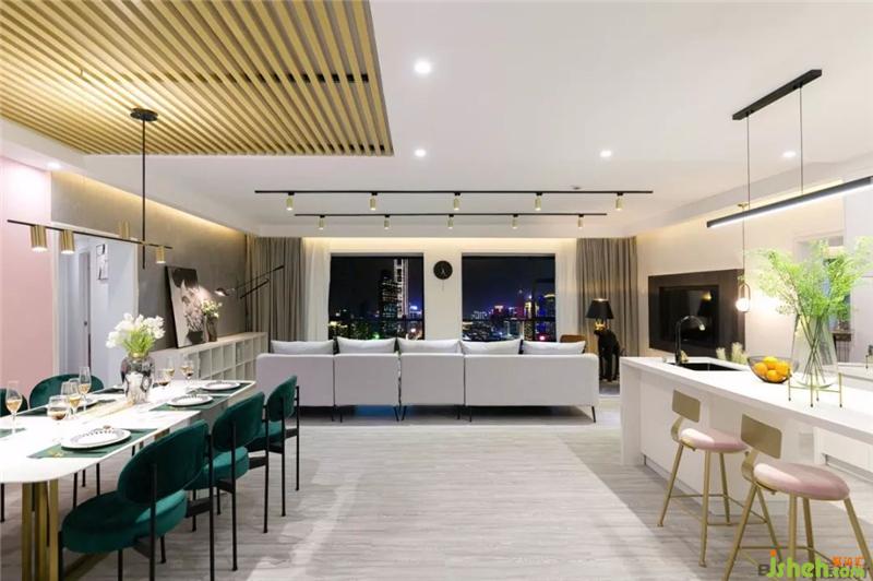 客厅舍弃了笨重的大吊灯,安装了两排轨道射灯,暖色调的灯光,让整个空间显得更加温馨。客厅的沙发没有按照传统布局朝向电视柜方向摆放,而是面向落地窗,横向的布局不尽宽广大气,且提高了观赏性,福田CBD的夜景尽收眼底。