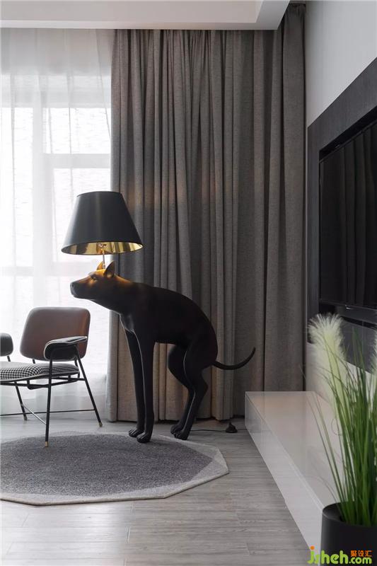 L型的浅色系沙发,符合民宿客厅用途,五六个人同时坐着也不会用拥挤,指不定还能来个[葛优瘫]。相框式的电视墙,独特的狗狗雕塑落地灯和金属吊灯,为客厅增添了质感。大理石的茶几,灰色调的窗帘,整体风格色系保持统一。