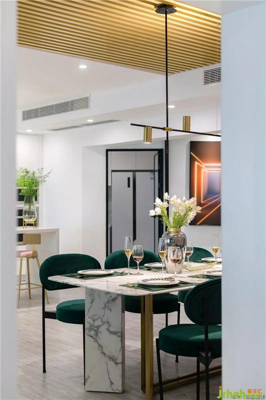 大理石餐桌+墨绿色餐椅+金属色系轨道灯