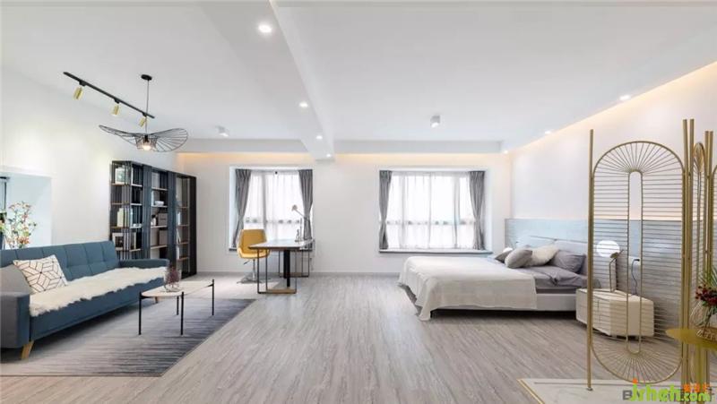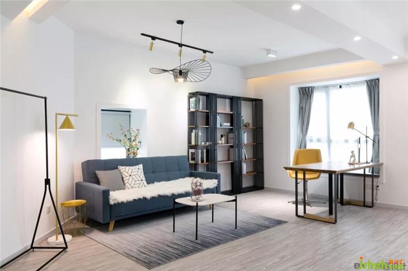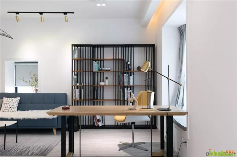 书房这一块区域,利用灰蓝色的沙发和金属落地灯缓和卧室的清冷气息。