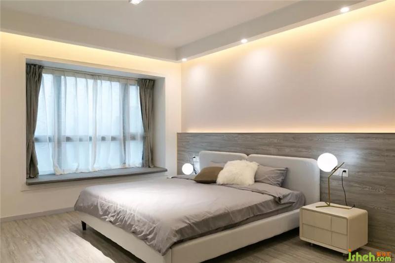 床头后方墙壁采用木地板上墙的方式,与地板同一色调,形成视觉的延伸效果。灰色调,沉稳大气,简洁明朗的北欧风格。