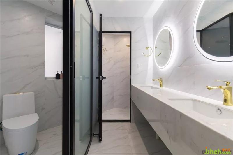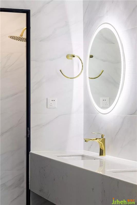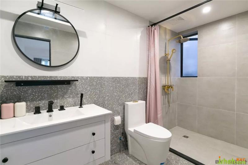 马桶、淋浴区、洗漱台三分离,两个洗漱台、两面带灯的智能镜,再加上卧室里的两个卫生间,每个区域都互不影响,民宿卫生间的使用问题也解决了。室内设计师