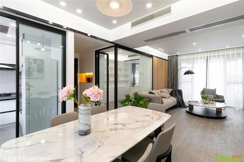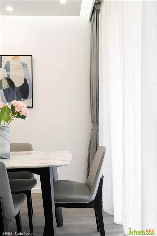 餐厅选用了一张白色大理石纹路的长方形餐桌,听说女主人特别喜欢花艺,所以我们也在整个空间里放置了各种各样的花瓶和绿植,让她以后有更多自我发挥的空间啦。室内设计师