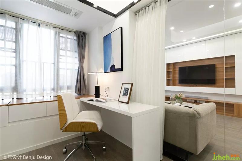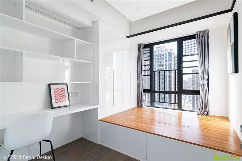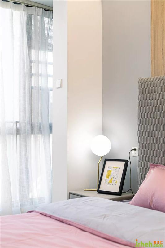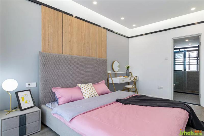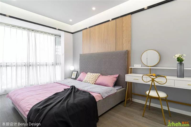 整个主卧的空间显得非常的通透和明亮,摆放一张1.8m的大床后依然丝毫不觉得拥挤,床头的背景墙设计沿用了客厅与书房隔墙的设计,保持统一的内外风格。右边则直接用化妆台代替了床头柜,顺便提一下,这个化妆椅的设计,简直是一眼就击中了老夫的少女心,果断拿下。