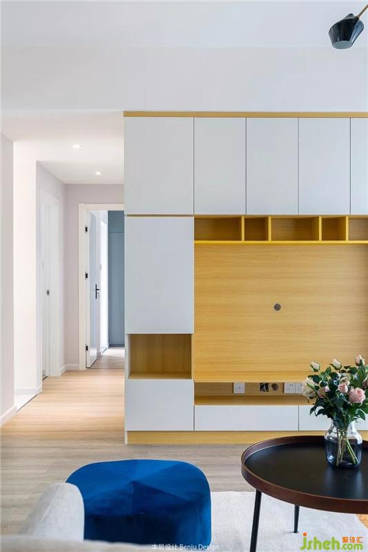 一进门就是客厅,没有可以作为玄关的区域且客厅空间也不是很大,所以增加了矮柜当鞋柜,分隔玄关与客厅两个区域,且矮柜不会遮挡客厅的光线。
