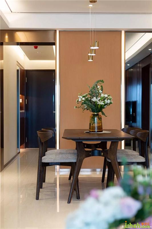 餐厅延续客厅的风格,烟熏法国橡木的餐桌,保留了木质的天然形态,纹理清晰可见。餐桌后方的茶色玻璃移门划分餐厅和厨房,高级的茶褐色使空间根据现代感。茶褐色空间,像极了梵高的名画,收割中的田野风景。墙上的挂画正是梵高的名作,业主的最爱。