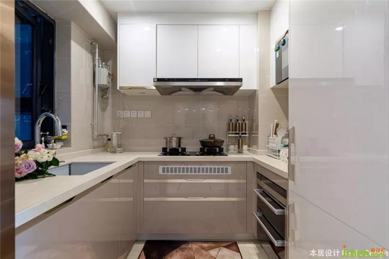 拉开移门,展现的又是不一样的风格。浅香槟色+白色的橱柜,厨具和冰箱都是嵌入式,平面的设计使得厨房看起来清爽整洁。装修设计