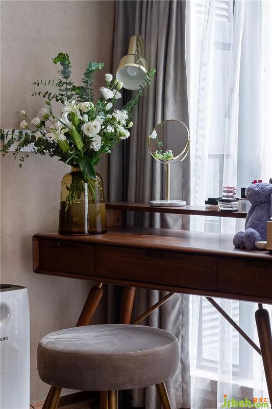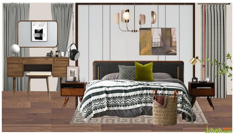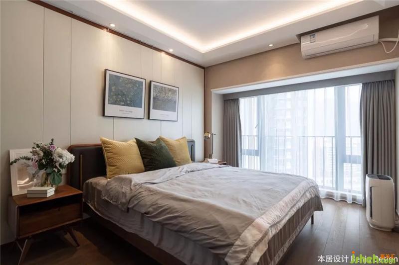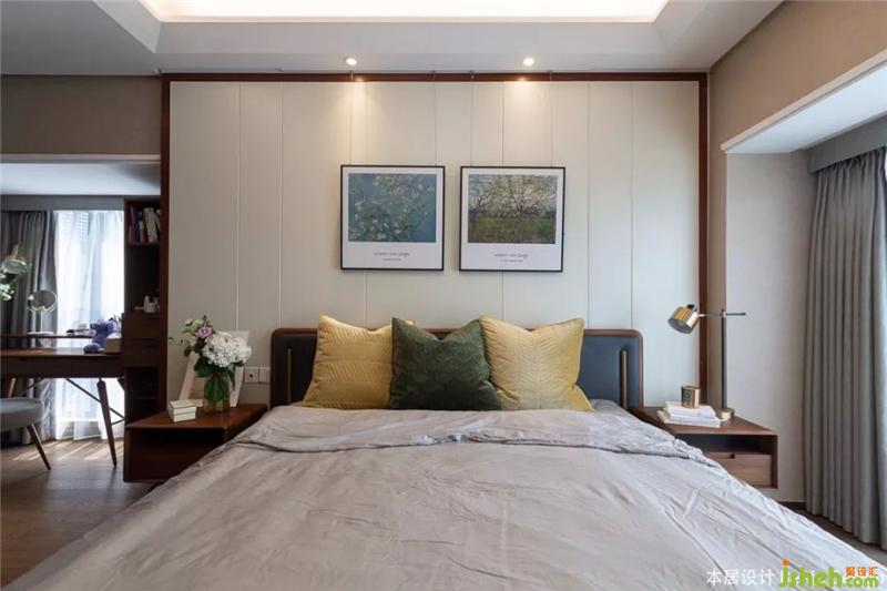主卧家具采用了北欧表情中最受欢迎的堪培拉系列,实木的床头柜与床架,精致的床头柜设计细节,圆润的边角线条,上层敞开式的储物格,方便放取物品。床头背景墙同样挂上业主喜爱的梵高画作。