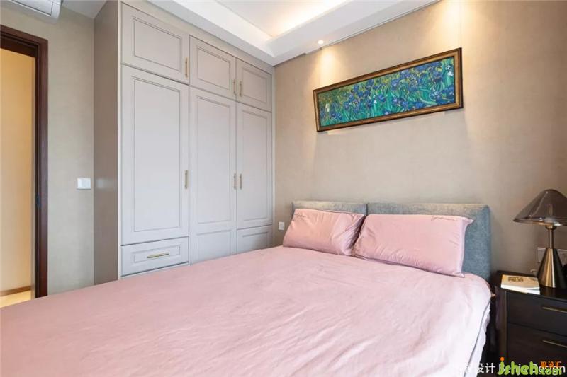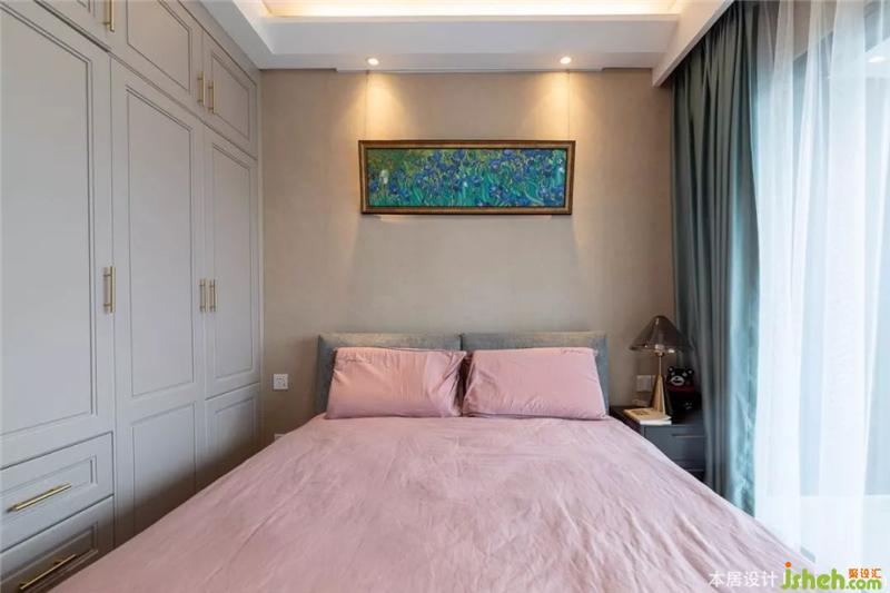 次卧与主卧风格大不相同,使用面积较小,因此定制一整面立体柜,皮粉色四件套搭配湖蓝色的窗帘,整体欧式风格更突出。装修设计