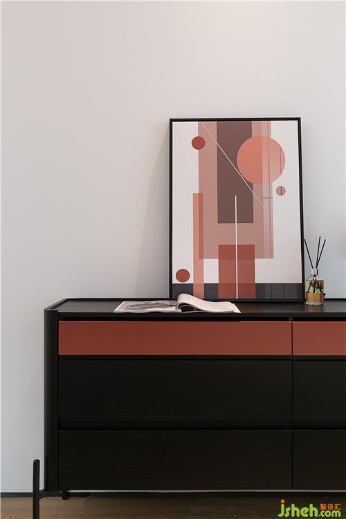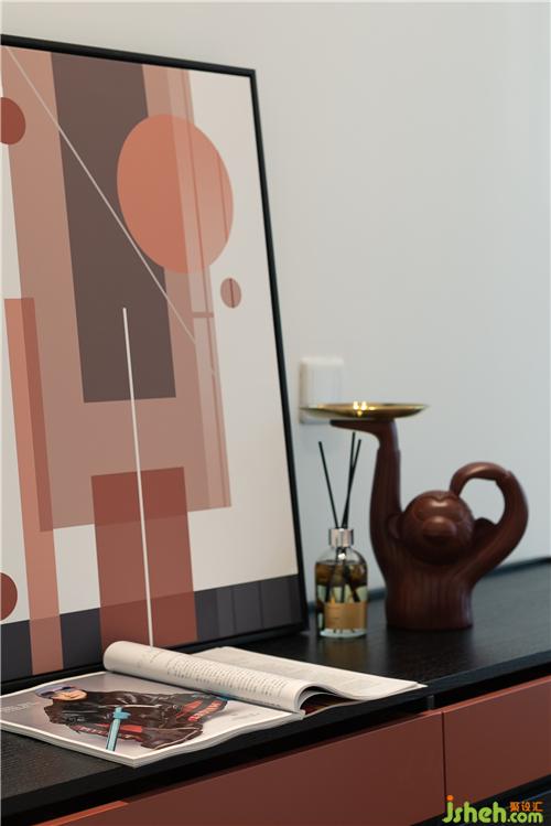 室内设计师非常注重空间的互动,床尾的置物柜上选择红色抽象几何挂画,与床头的纹理挂画呼应,仿真动物的摆件及装饰用品,让卧室整体氛围雅致而温暖。