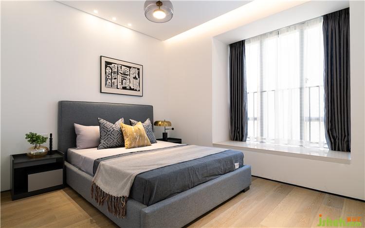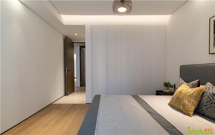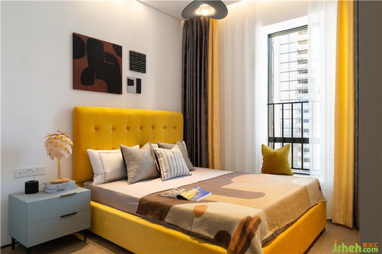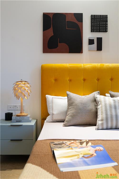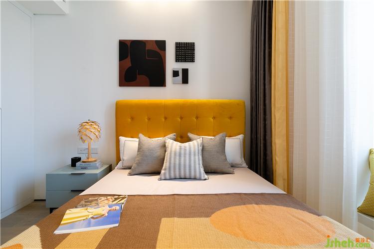整体白色墙面和柜体,搭配深灰蓝色的床品,经典而通透的色调展现出一份优雅与闲适。黄色抱枕,带入一份温馨,与蓝白交叠出一份悠然与恣意。