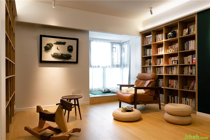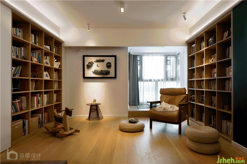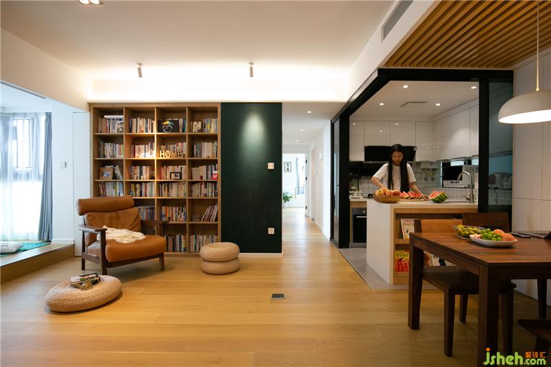 ▼在家居精细化的变化中,就提到了客厅沙发电视变多元起居。就如该案例一样,客厅无沙发电视背景墙设计,取代的是两面顶天立地的书柜,要说为什么是书柜,因为爱学习的一家人,平常都喜欢看书。室内设计师