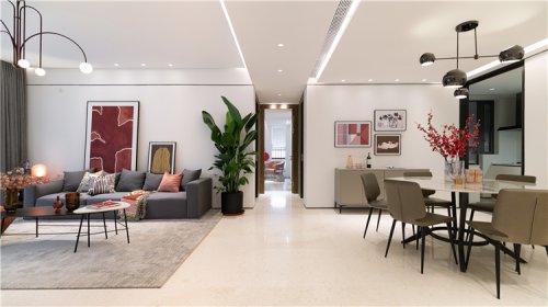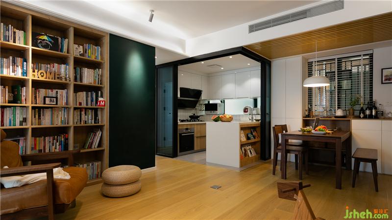 ▼打通封闭的厨房空间,用多扇对角推拉门做成可分可合式,这样一来,不但增强了餐厨客三个空间的交互性,也使得整个布局也变得更加活泼丰富。