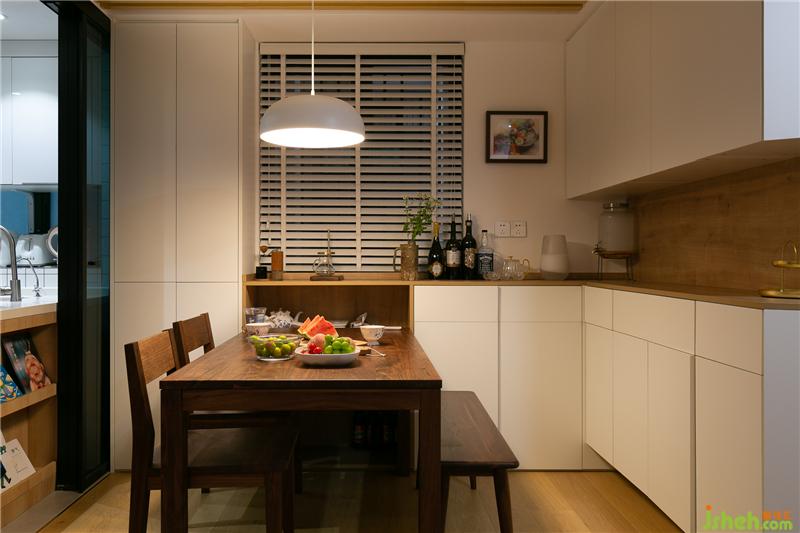 ▼可分可合式开放厨房的社交属性,让设计师更需要注意厨房与其他空间风格上的统一协调性。图中也可以看出,白色与木色的搭配呼应了餐厅空间,而极致的收纳,也在厨房中得到了充分的体现。室内设计师