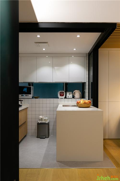 ▼说到走廊过道,这里不得不多提一下,为了避免空间的浪费,设计师在走廊的两侧附加了三个功能区——厨房外置大冰箱;干湿分区卫生间;电系洗衣家政区。这样一来,不仅避免了单独走廊带来的沉闷感,空间利用率也大大提升。