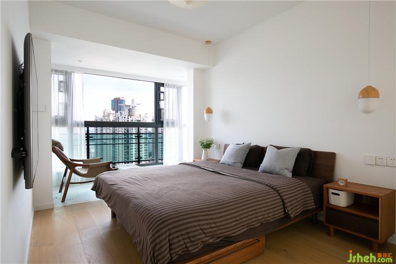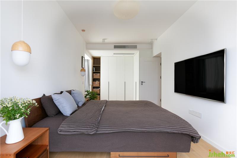 ▼宽畅的主卧空间,咖色的条纹床品在线条的纹理下彰显着细腻质感。纯白的主色调配搭着木质底色,将卧室空间打造的优雅而舒缓。而床头的小雏菊绿植,也增添了几分空间的生机与活力。室内设计师
