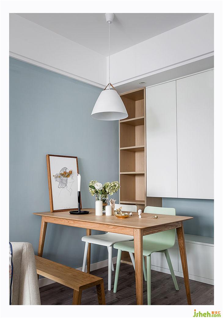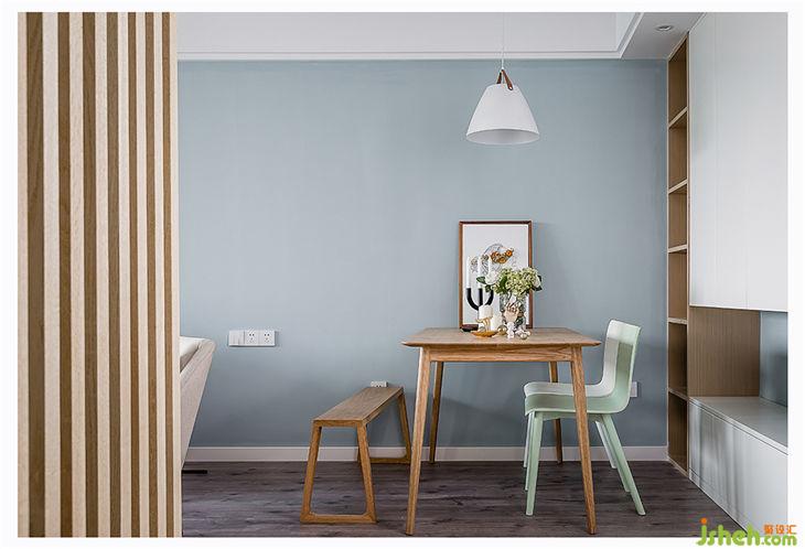 ▲餐桌区域虽然小,但是色彩的搭配上和设计师讨论了很久,也看了非常多的餐桌方案。最后选择了白橡木的餐桌和条凳,然后和灯以及整体空间色系搭配的椅子,一眼望去的东西全是淘宝买的,质量还不错。