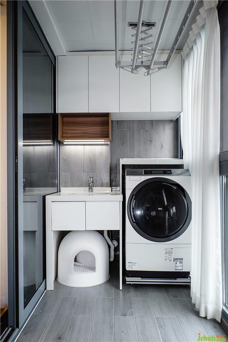 这款洗衣机要比一般的要高,在一米左右。台盆下留了比较高空间便于放猫窝在这里,柜子下的灯在夜晚能看到一些细节。顶柜线条利落大方,简约又大方。