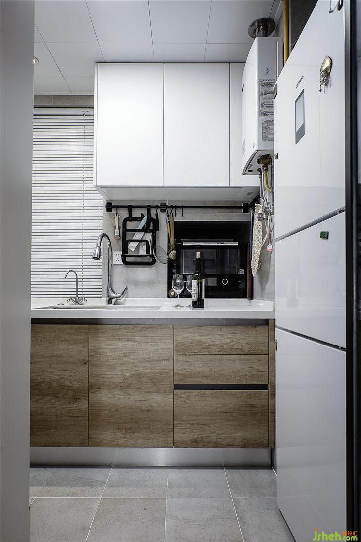 厨房安装了百叶窗,关上便不用害怕做饭时的油烟,而玻璃的透明质感使得空间明亮许多,白色的台面和墙壁显得简洁自然。