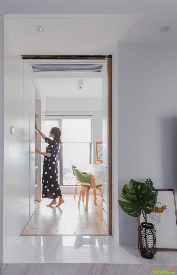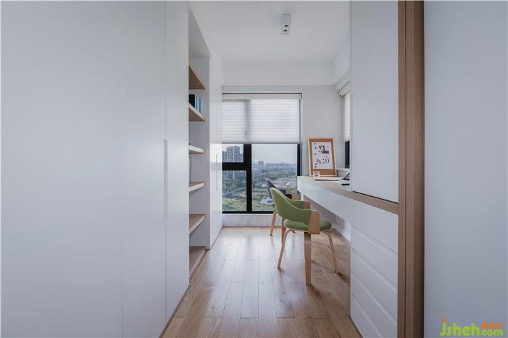 色彩上面以文艺白为基调,搭配地面原木色的实木地板,绿色布艺靠椅为整个空间增添了一丝活力,开放式的书架,白色在整个空间内一点也不无聊,硬软装的结合,流露出简约的美感。