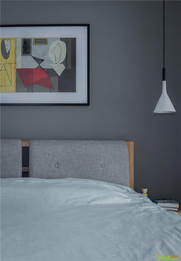 床头背景采用高级灰,床品延续了整体色调,床头装饰画采用撞色手法,冷暖色调的配合让空气盈满安然静谧的气息。这种适宜睡眠休憩的氛围让人有种想立刻就躺在床上的冲动。