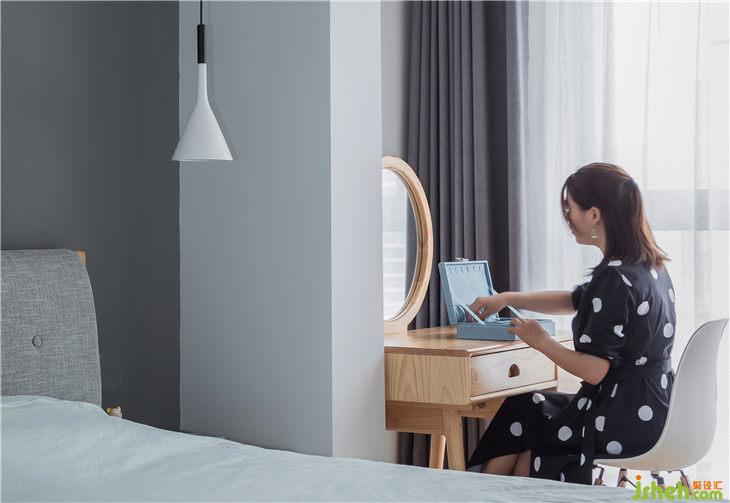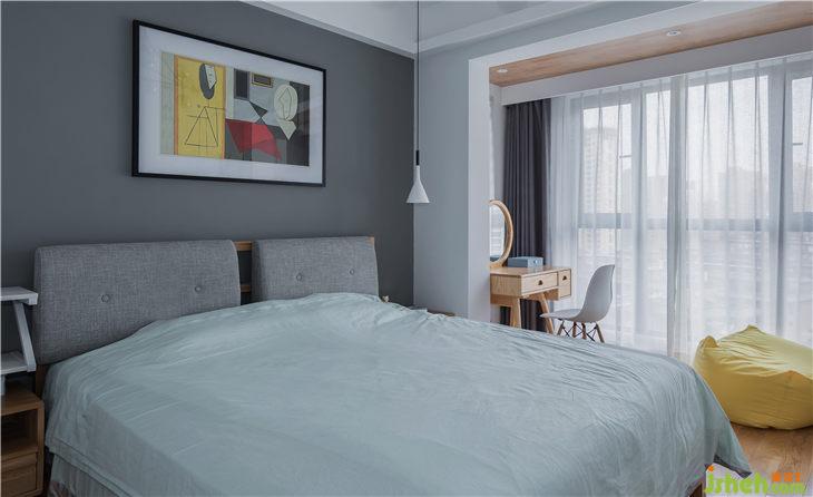 卧室整体为了安静舒适,选择深灰色的涂料,有人担心很冷的,加入木色家具、米色纱帘空间就温馨起来啦。