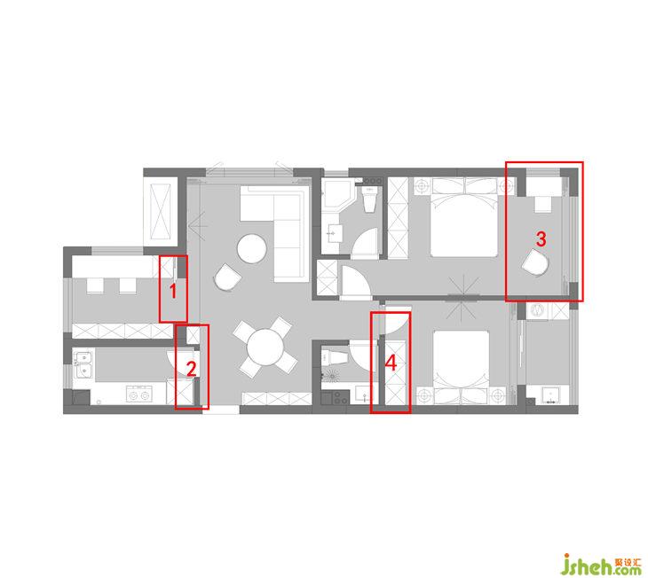4.是把次卧的墙体往次卫的方向挪动了,在次卧增加了衣物收纳柜。