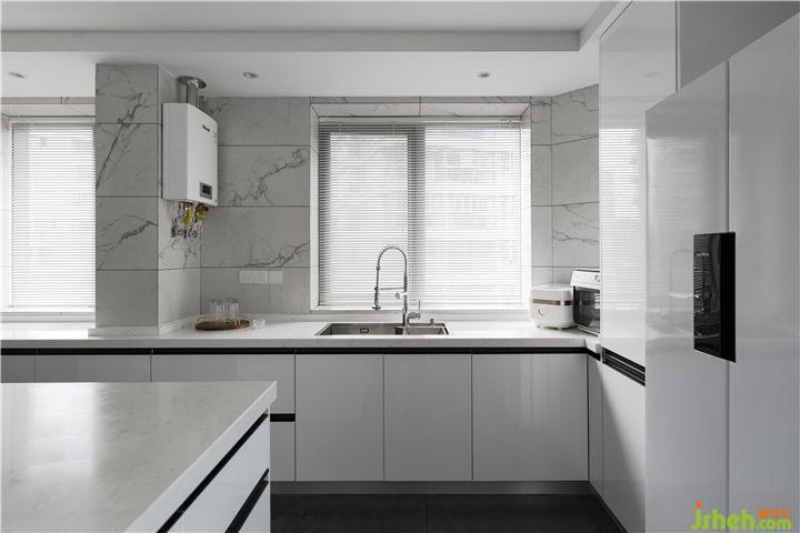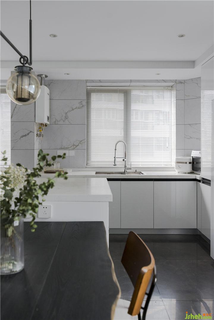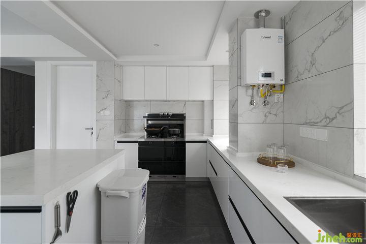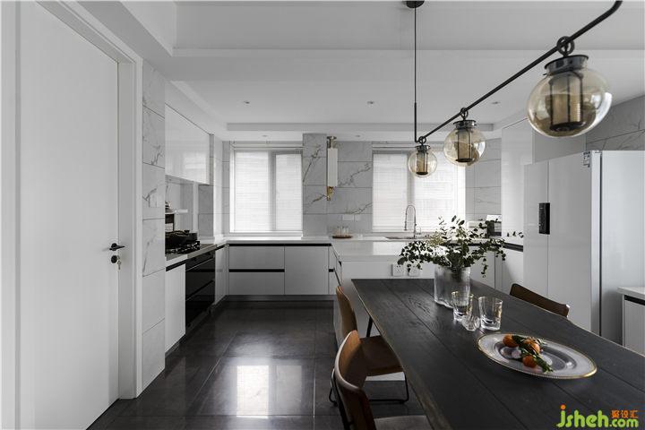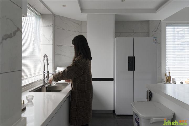 因为原厨房位于整个空间的中间位置,厨房到餐厅的生活动线很不方便,所以敲掉了小房间的墙,把北面的光线引入到户的同时又扩大了厨房使用空间!让厨房、餐厅、客厅成为一体,让整个空间变得更加敞亮、光线通透。