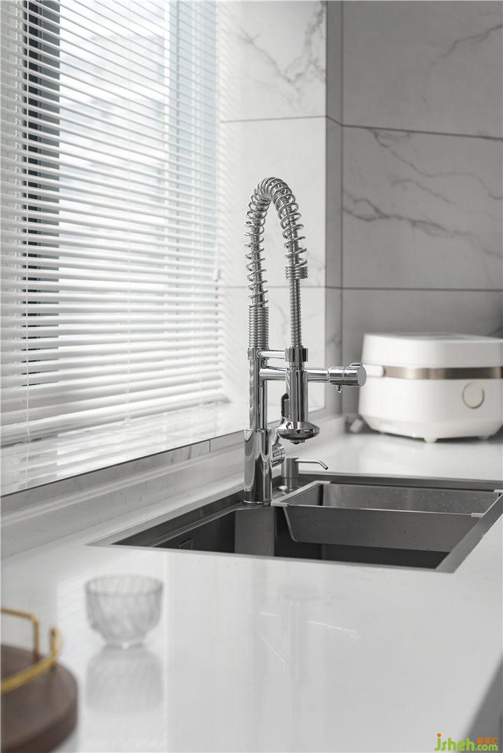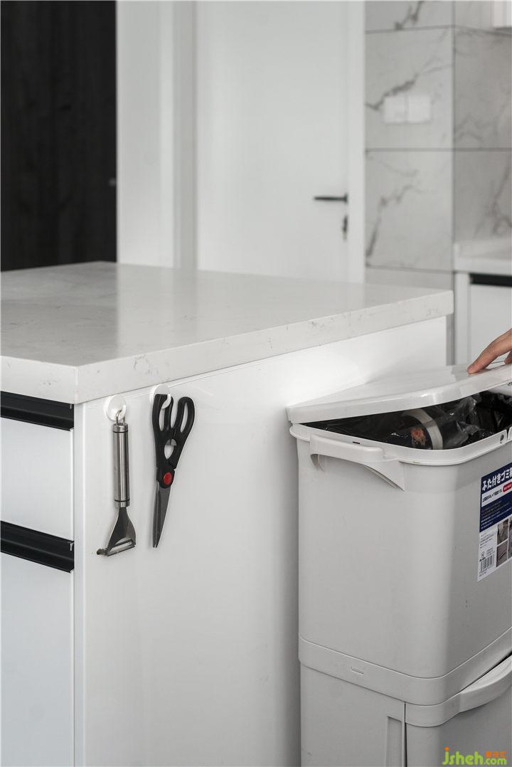 伸缩式水龙头为屋主日常洗东西提供了很大的便利,同时常用的削皮工具放在垃圾桶旁会让我们需要操作的时候更加顺手!