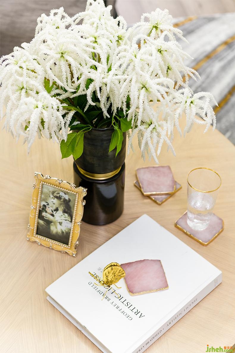金色的圆茶几,几何形状的靠垫与地毯,盛有白色鲜花的容器令客厅的小角落散发出诱人的光芒,墙面的建筑摄影图更是锦上添花。